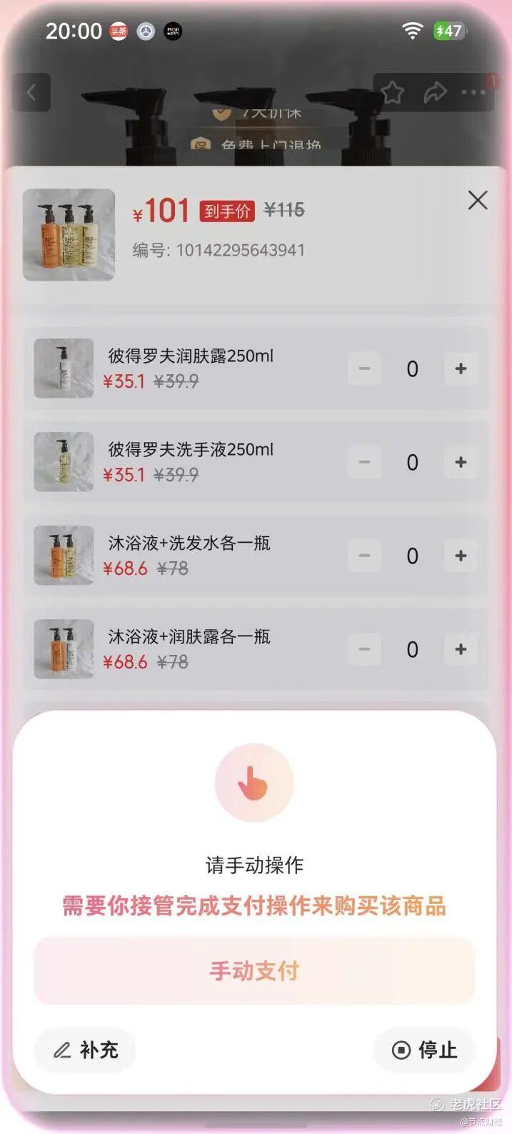 比如,我想在京东买最便宜的希尔顿酒店里彼得罗夫同款洗浴三件套,大概耗时2分钟,豆包助手提醒我,已经找到我需要的产品了,我只需要在app里点“手动支付”,就能直接跳转京东购买商品了。