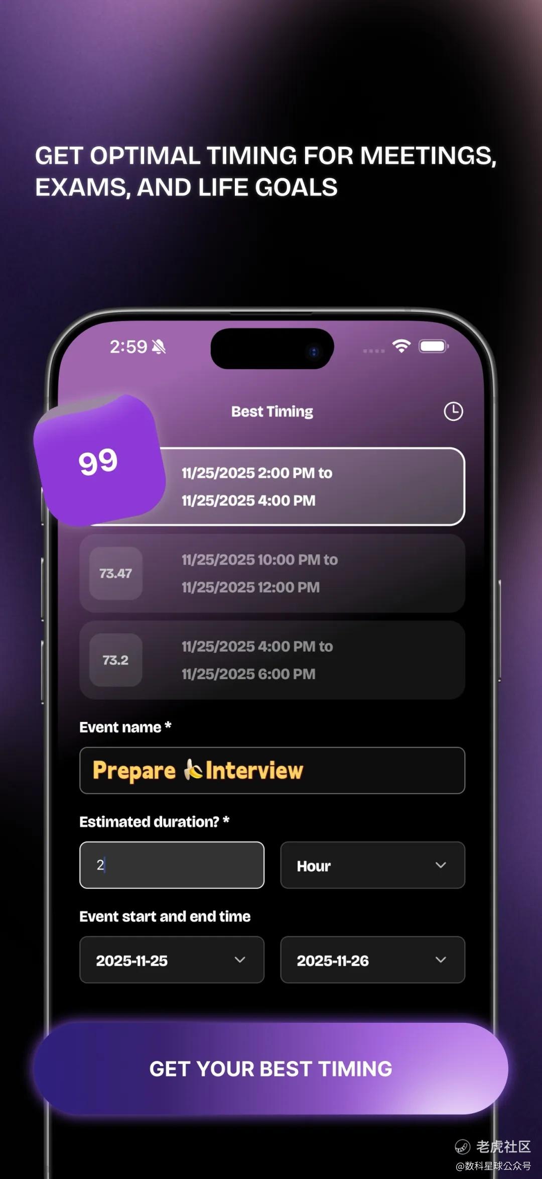 基于这一需求,Timing的产品逻辑逐渐清晰:以用户目标为核心,通过能量模型测算不同目标的适配时机,将命理预测转化为具体的行动指引。