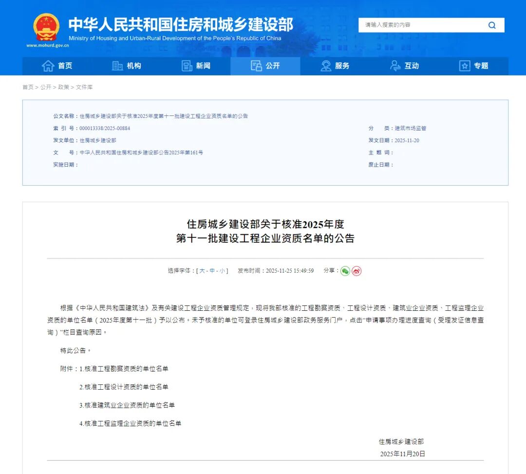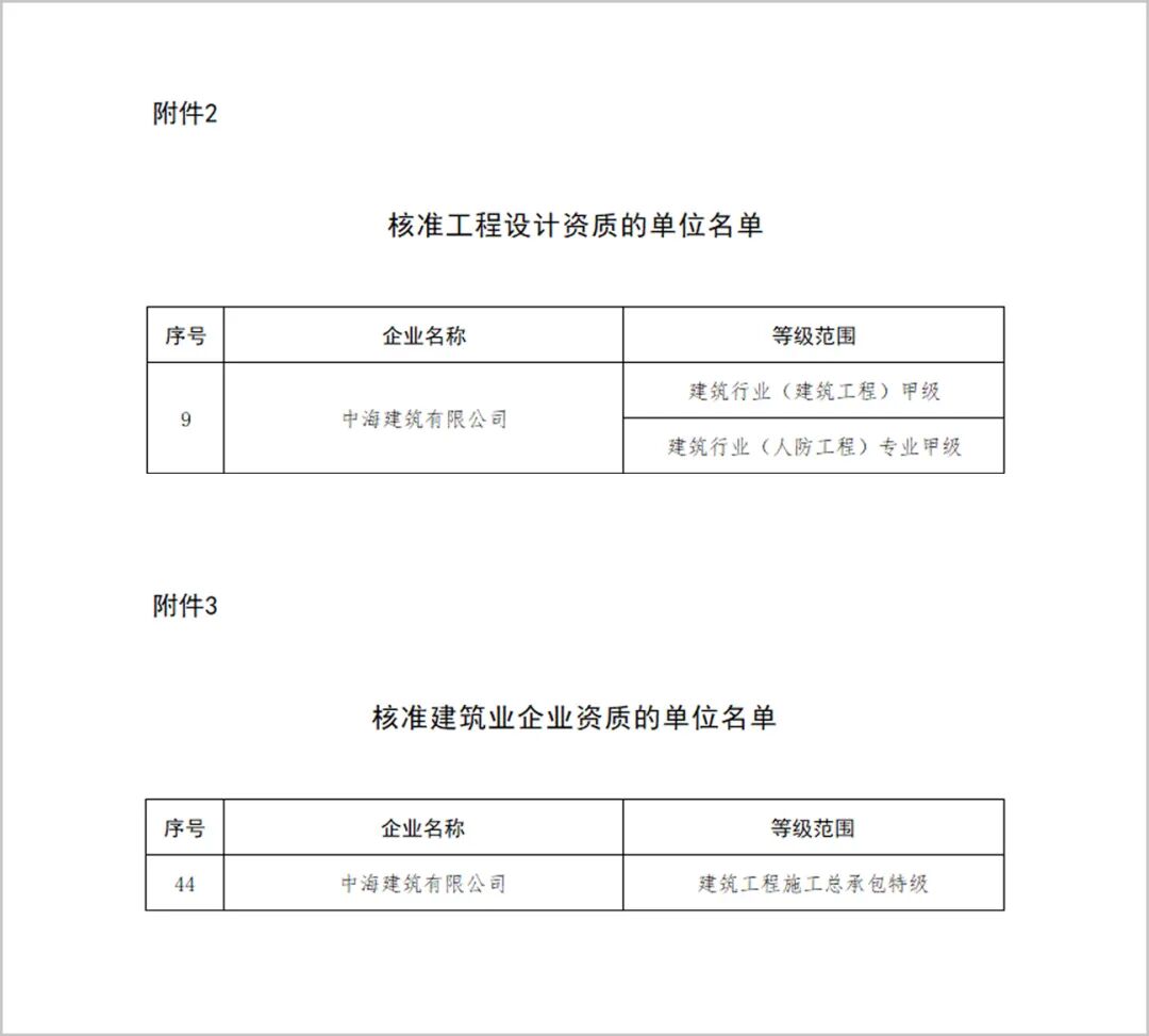 近日,国家住房和城乡建设部发布《住房城乡建设部关于核准2025年度第十一批建设工程企业资质名单的公告》,中海建筑有限公司成功晋升建筑工程施工总承包特级资质,同时获得工程设计建筑行业(建筑工程)甲级和建筑行业(人防工程)专业甲级资质。