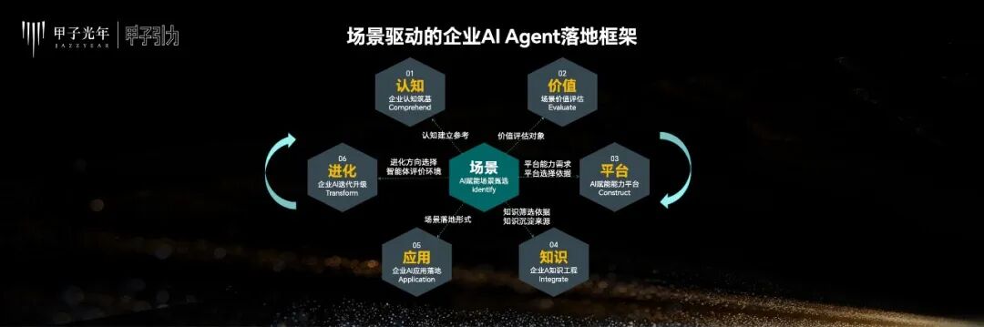 回归到AI这个主题,无论是龙湖还是千丁数科,我们在做企业级AI应用时,核心始终围绕着“场景”。千丁数科不做底层基础设施,算力和大模型通过购买成熟服务解决,我们的重心在于上层场景的探索。我们将企业AI Agent的落地应用路径总结为六步:认知、价值、平台、知识、应用、进化。