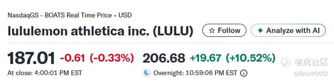 运动休闲巨头 $lululemon athletica(LULU)$ 周四盘后一改全年低迷走势,股价暴涨超10%,至206.68美元。触发这波强劲反弹的,是公司亮眼的第三季度成绩单、上调后的全年指引,以及市场对CEO更替带来的潜在转折憧憬。
