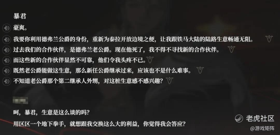 例如,面对开场的求救者“乔伊”,她的第一反应是“可怜,但与我无关”,直到对方证明自己的价值;她在游戏内与暴君和点金手的谈判与博弈,不是干巴巴的诉说与恳求,而是晓之以利害,摆出自己的筹码,用利益与对方要害来达成谈判目的。