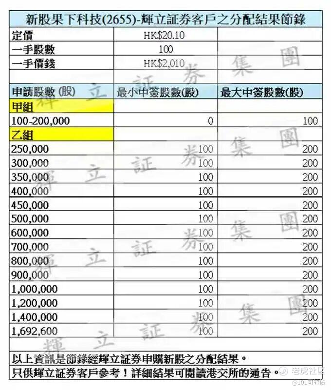 $果下科技(02655)$ 果下科技(2655)出分配结果了,甲组全员抽奖,乙组全员1-2手;定价:20.10,一手100股;恭喜中签的老板们!预测涨幅大概是40%,具体分析可以看看上一篇文章,只做参考,不做投资买卖建议。