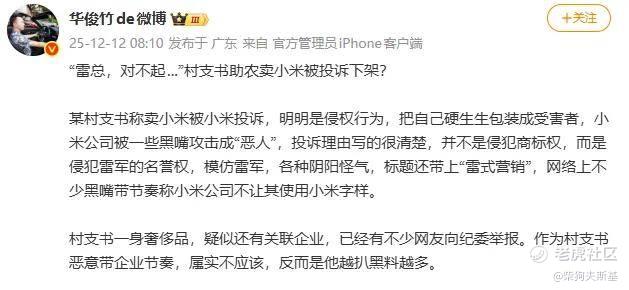 关于小米和雷军的新闻如今是越来越魔幻了!比如今天的一条热搜——村支书卖小米被投诉下架。