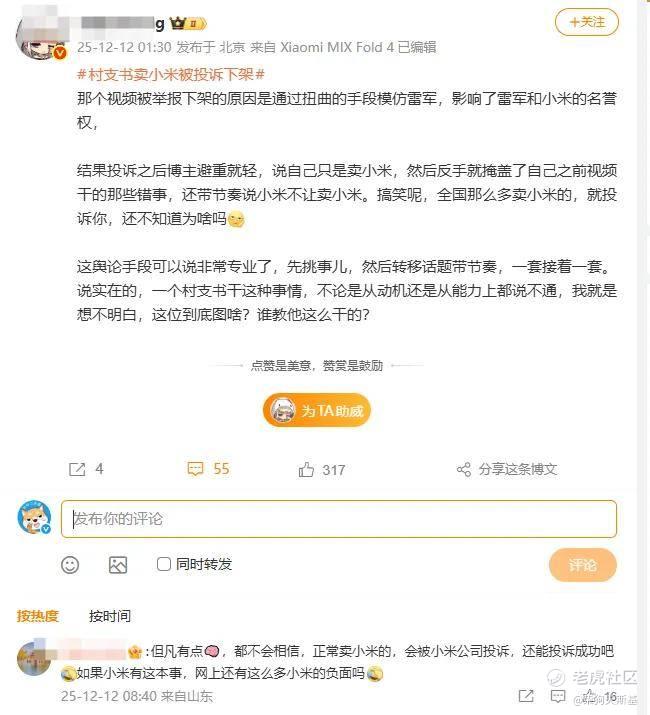 我们来看看小米的投诉理由到底是啥?根据这位村支书晒出的投诉截图:该作者通过戏谑化,夸张化的表达方式,刻意模仿我司高管在介绍产品时的形象与风格,经典表述逻辑,标志性句式,语气语调等,并关联"雷氏营销"等话题,发布虚假、误导性言论,系恶意丑化,贬损,污名化我司高管形象。此类内容不仅严重损害相关高管的个人名誉,更在公众中制造混淆,误导公众对我司企业文化,经营理念及产品价值产生错误认知。