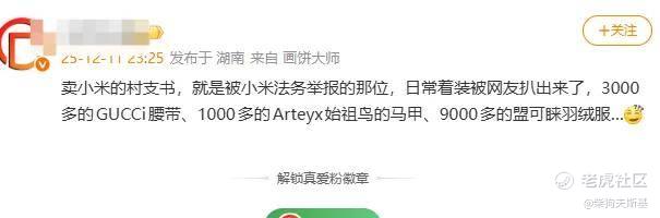而随后,也有不少网友扒出,这位村支书视频中穿戴GUCCI腰带(约3000元)、始祖鸟马甲(约1000元)、盟可睐羽绒服(约9000元)。
