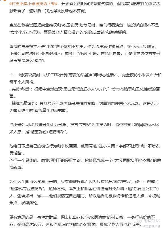 他绝口不提自己的模仿行为和争议画面,反而高喊 “连小米两个字都不让用” 和 “不给农民活路”。他把一个具体的、商业规则下的侵权争议,偷换概念成一个 “大公司欺负弱小农民” 的悲情叙事。