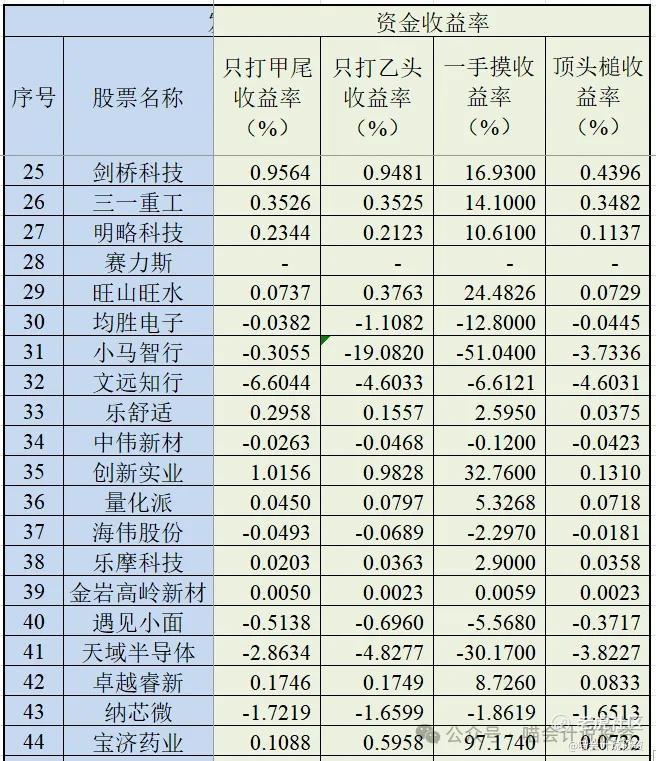 这是最近20只票的一手摸、甲尾、乙头、顶头槌按照首日收盘价计算的收益率,还未计算融资利息。