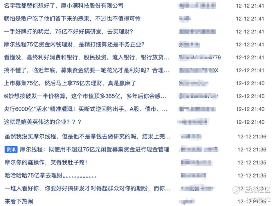 摩尔线程公告发布后,很快引来了投资者们的关注。有投资者在其股吧质疑,“75亿不好好搞研发,去买理财?”“是精打细算还是不务正业?”。也有部分投资者对其行为表示支持,认为“合理利用资金保证现金充足的前提下,增加营收而已。”