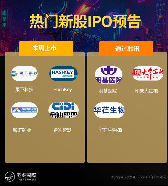 招股端,招股的公司包括南华期货(AH)、印象大红袍、明基医院、华芢生物-B、希迪智驾(18C)、智汇矿业、HASHKEY、果下科技等8家公司。其中,HASHKEY是香港最大持牌数字资产平台,招股价范围5.95-6.95港元,预计以中高端定价;希迪智驾是港股第7家18C特专科技公司;印象大红袍是国有知名文旅服务商;南华期货是中国领先的期货公司,出海业务亮眼;