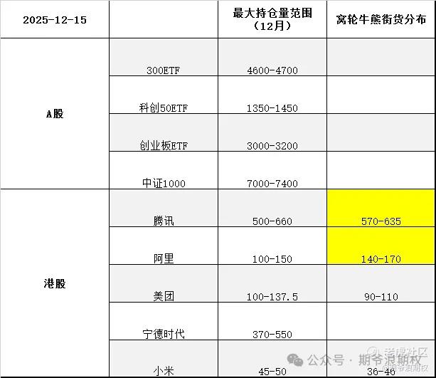 不管行情怎么样,期权复盘找方向。下图是今天大A的3个ETF和中证1000,以及港股的腾讯、阿里、美团、宁德和小米的最大持仓量范围以及窝轮牛熊分布范围,也就是12月的期权筹码分布,黄色的表示跟上个交易日有变动。