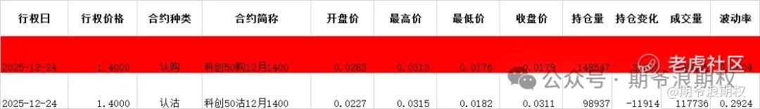 (2)科创50ETF:12月最大持仓范围1350-1450,今收1.389,下跌2.05%。期权12月主力合约,认购1350-1450合计增仓4.6W张,其他行权价都是减仓,其中1500及以上行权价减仓较多,合计1W张;认沽全部都是减仓,集中在1350-1500,合计2.6W张。变化超过1W张的仓位如下,红色是增仓较大的。