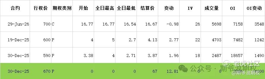 (1)腾讯:12月最大持仓范围500-660,窝轮牛熊街货分布590-635,今收603.0,下跌2.11%。期权盘路变化超过1000张的仓位如下,浅绿色是深度实值减仓,12月670沽减仓4000张。也就是有个大佬,原计划准备了2.68个亿,计划12月底按照670的价格买入腾讯股票,现在打退堂鼓了。值得注意的是,原来腾讯窝轮牛熊街货分布的压力位是705,最近下降到670,然后下降到今天的635。总体来说,市场对腾讯的未来有些不确定。