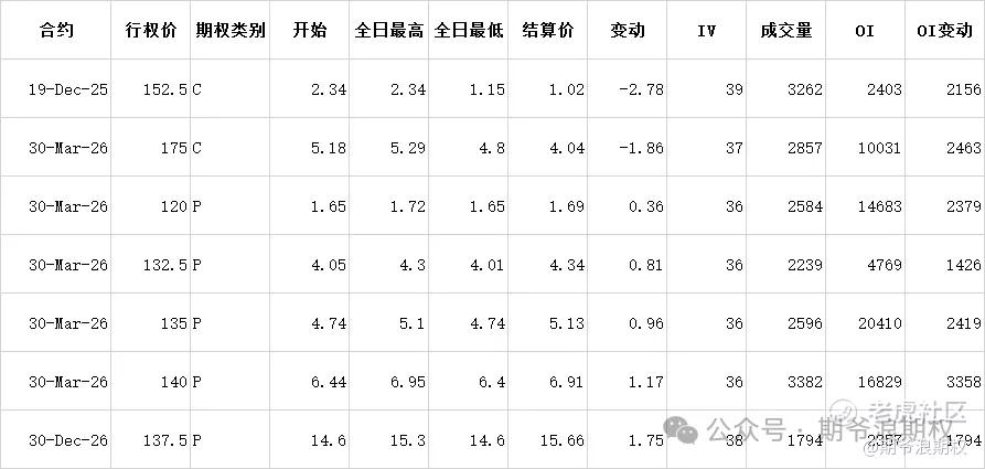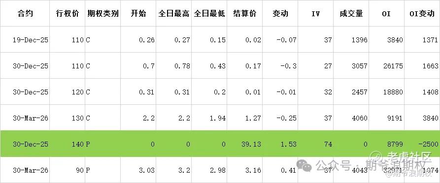 (3)美团:12月最大持仓范围100-137.5,窝轮牛熊街货分布90-110,今收100.9,下跌1.46%。期权盘路变化超过1000张的仓位如下,浅绿色是深度实值减仓,12月140沽减仓2500张。也就是说,有个大佬原计划准备了1.75个亿,按照140的价格买入美团股票,现在放弃了。市场对美团未来的预期在下降,反弹的概率在降低。