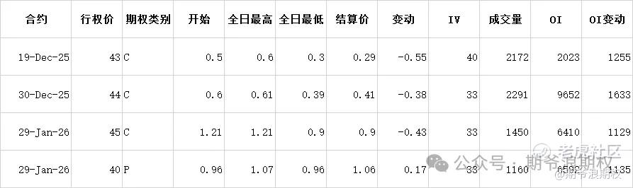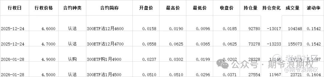(1)沪深300ETF(沪)期权:12月最大持仓范围4600-4700,今收4.667,下跌0.58%。期权12月主力合约,认购和认沽几乎全是减仓。认购减仓集中在4600-5250,合计1.0W张;认沽减仓集中在4500-4800,合计3.1W涨。12月合约净撤出,但是部分往1月合约移仓。变化超过W张的仓位如下: