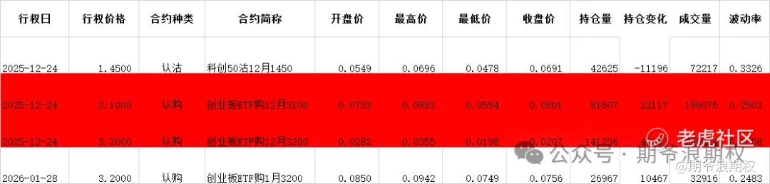 (3)创业板ETF期权:12月最大持仓范围3000-3200,今收3.120,下跌1.70%。期权12月合约,认购以增仓为主,集中在2950-3500,合计7.9W张;认沽有增有减,增仓集中在1700-1850,合计1.2W张,其他行权价增仓减仓很分散也没有明显规律。变化超过1W张的仓位如下,红色是增仓较大的。