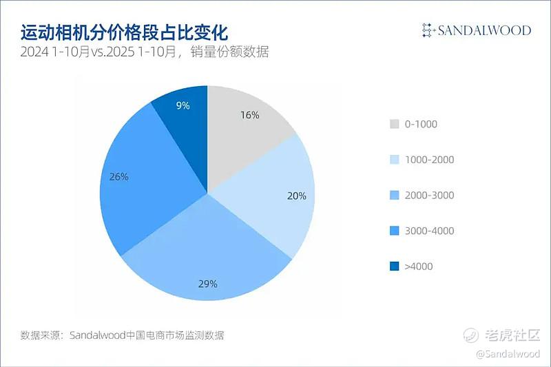 整体结构变化显示,中高端加速扩容,2000–4000 元已成为中国运动相机的核心主流消费带。