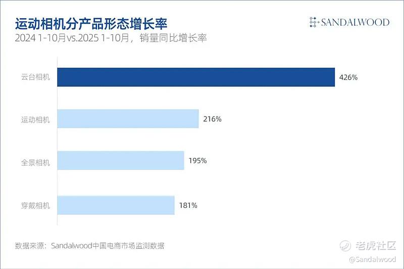 根据 Sandalwood 中国电商市场监测显示,2025年截至 10 月,运动相机销量达到 476 万台,同比增长 +252%,销售额同比增长 +316%,显著跑赢销量增速,体现中高端产品的强劲放量;同时 ASP 同比提升 +18%,验证消费者对高性能影像设备的投入意愿不断增强。
