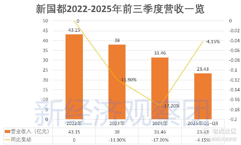 最直观的信号来自营收端的持续下滑。根据公司披露的年度财报,2022-2024年,新国都分别实现营业收入43.15亿元、38亿元和31.46亿元,其中2023年和2024年分别下跌11.9%和17.2%,跌幅逐渐扩大。进入2025年,新国都的下行趋势仍未扭转,上半年公司营收15.27亿元,同比下降3.1%;前三季度营收23.43亿元,同比继续下降4.15%,主营业务始终缺乏有效增长引擎。