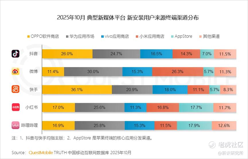 据QuestMobile最新数据显示,2025年10月主流内容平台的新安装用户来源呈现明显的渠道分化特征:快手新用户超三成来自OPPO软件商店,而小红书、B站的苹果AppStore渠道来的新用户占比相较于其他平台而言更多。