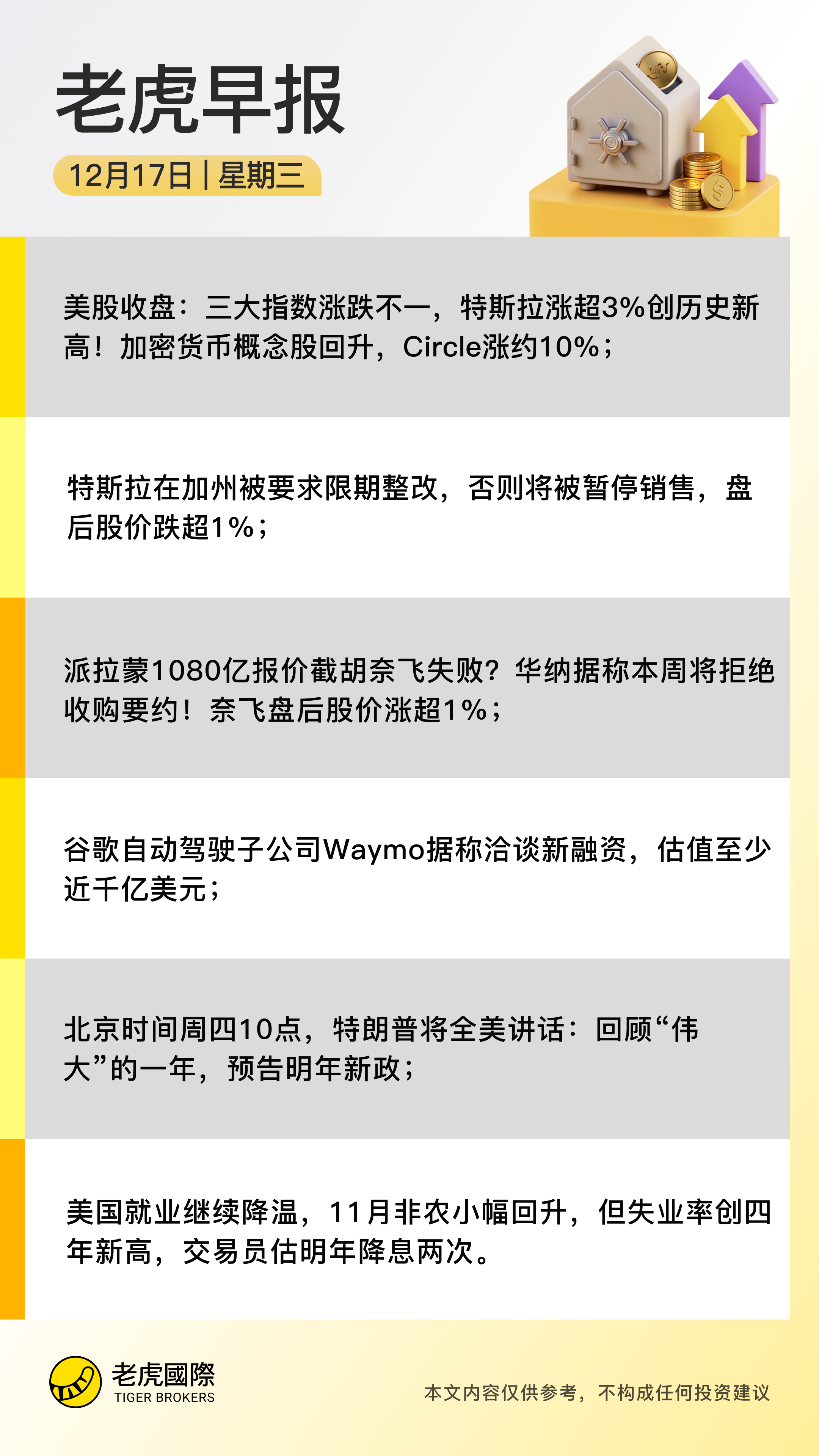 美股收盘|三大指数涨跌不一,特斯拉涨超3%创历史新高!加密货币概念股回升,Circle涨约10%
