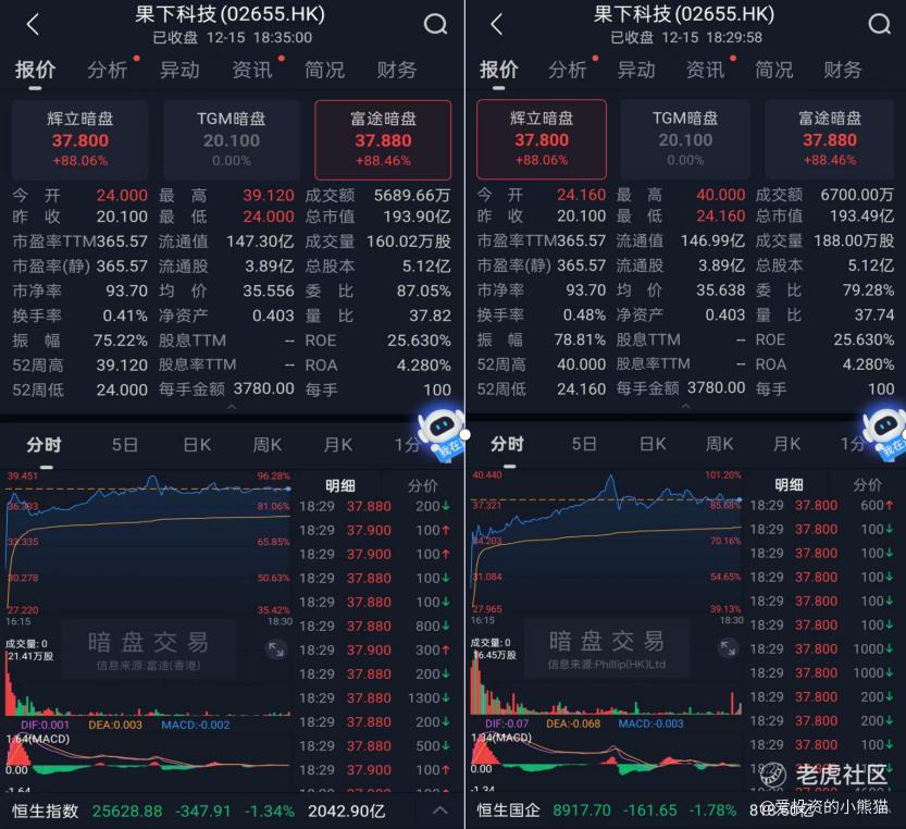 果下科技(02655.HK)辉立暗盘以24.16港元高开,瞬间拉升一波,再震荡整理,最高摸到40.00港元,尾盘稍有回落,以37.80港元报收,涨幅为88.06%,振幅78.81%,成交6700万港元。