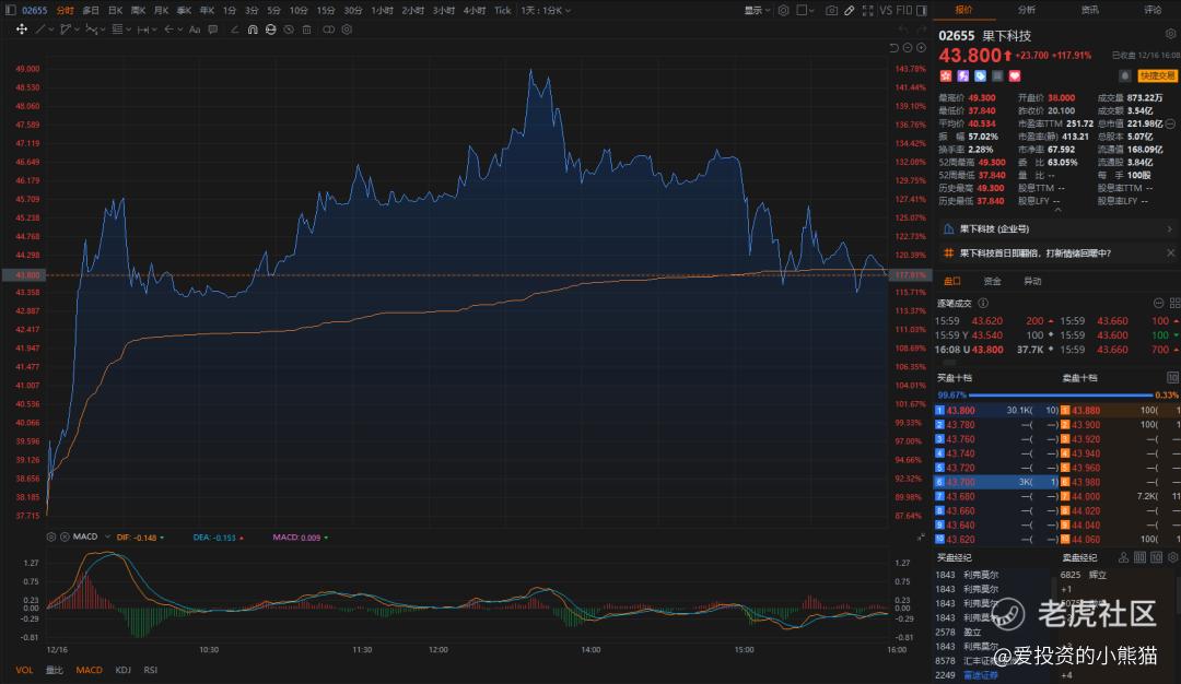 2025年12月16日,果下科技正式登陆港交所主板,凭借“AI+储能”的稀缺赛道属性,首日股价表现强劲,全程维持高涨幅态势。公司发行价为20.1港元,开盘即高开89.05%报38港元,盘中最高触及49.30港元,涨幅一度超145%,最低探至37.84港元,最终收于43.8港元,较发行价大涨117.9%,总市值超221亿港元。