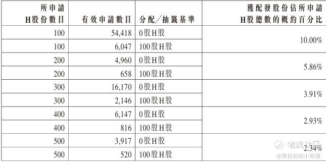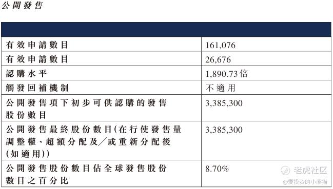 配售情况:161076人认购,这次公配1890.73倍,由于执行分配机制B, 回拨比率无,国配有3.63倍,一手中签率10.00%,认购2500手稳中1手,同时乙组9749人申购,其中顶头槌申购665张,获配率0.01%-0.07%。