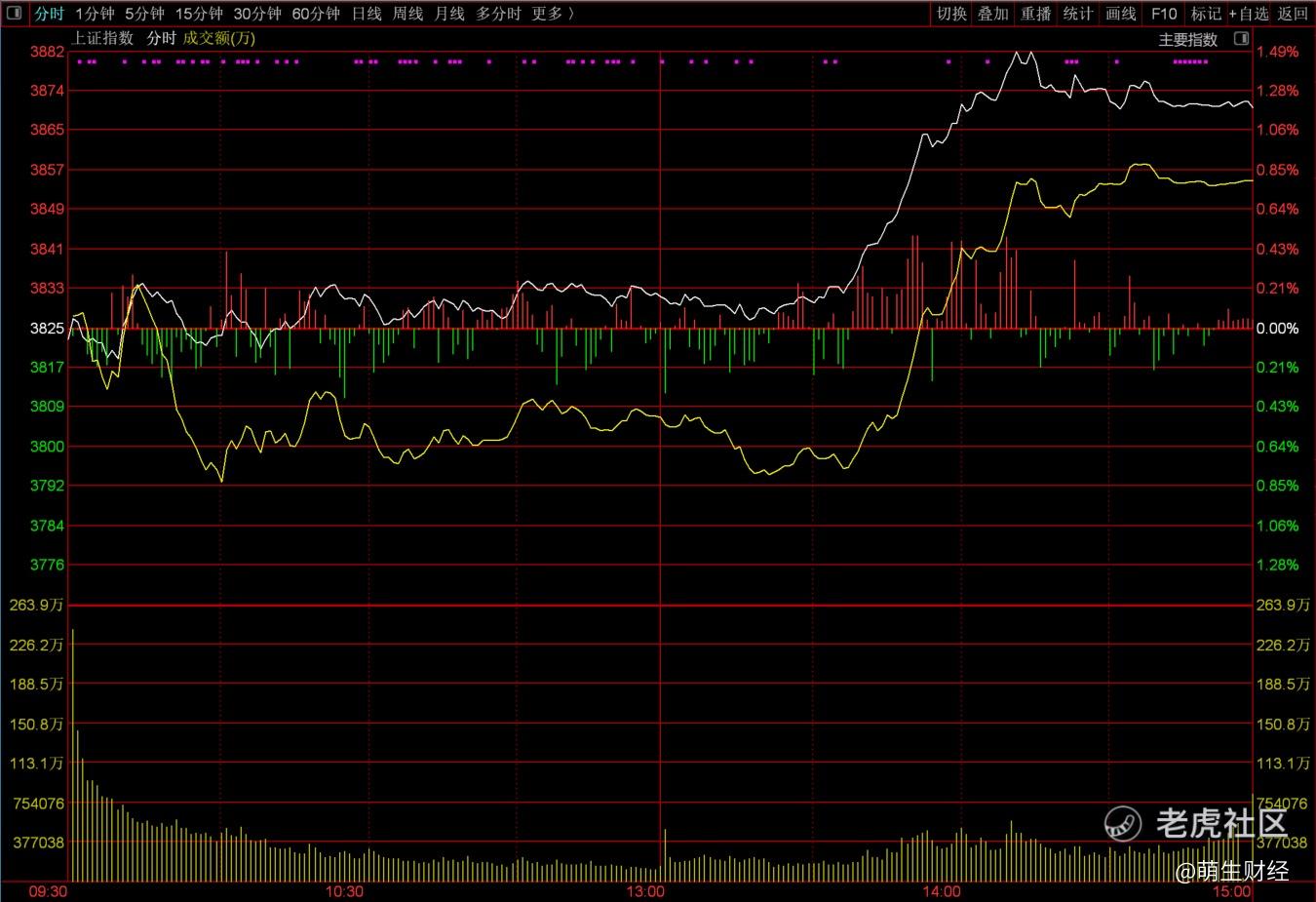 其实就在市场命悬一线的时候,如果下午市场再没有增量资金,那么指数就真的会出现下挫,与之而来的是抛盘的增加,所以13点30分之后,大家会发现突然之间一股强大的资金快速的将指数拽了起来,沪指在短短的35分钟上涨了50点,涨幅达到了1.49%,盘中指数最高到了3881点,创业板指数则上涨了3.58%。