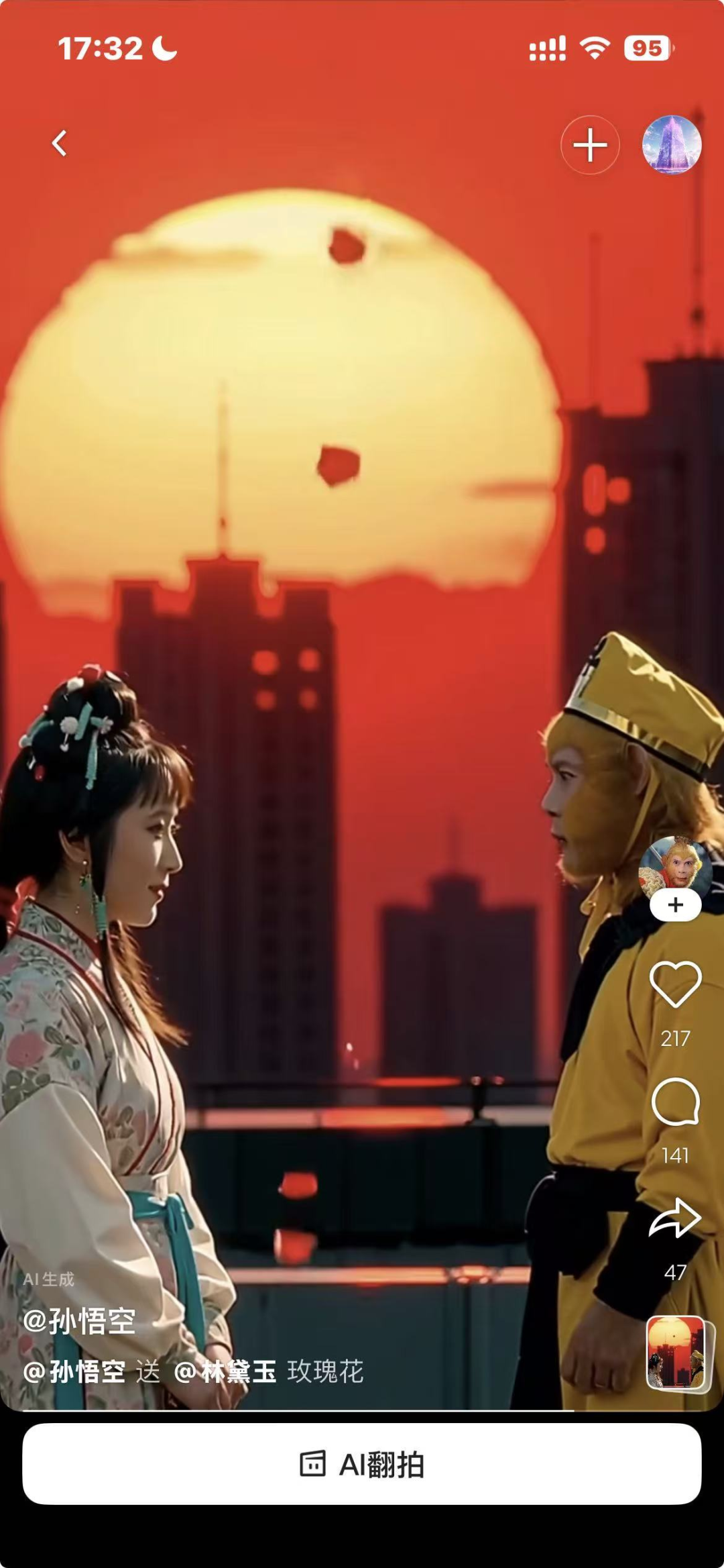 比如,悟空可以和黛玉告白。我们用“AI翻拍”功能翻拍了一位创作者的原创视频。