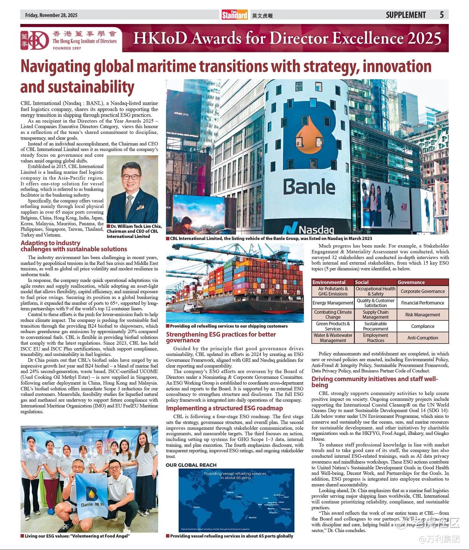 我们由衷感谢《英文虎报》近期对CBL International Limited(纳斯达克:BANL)的深度报道——《以战略、创新与可持续发展推动全球航运转型》。这篇报道精准捕捉了我们将ESG理念深度融入企业运营核心的战略视野——这不仅是合规要求,更是构建长期韧性与创造价值的战略必需。