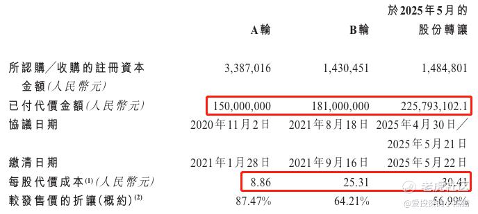 B轮融资认购注册资本143.0451万元,已付代价1.81亿元,每股成本升至25.31元,较发售价折让64.21%,协议与资金缴清分别在2021年8月18日、9月16日落地;2025年5月的股份转让环节,收购注册资本148.4801万元,已付代价约2.258亿元,每股成本进一步增至30.41元,较发售价折让56.99%,协议与缴清时间为2025年4月30日、5月22日。