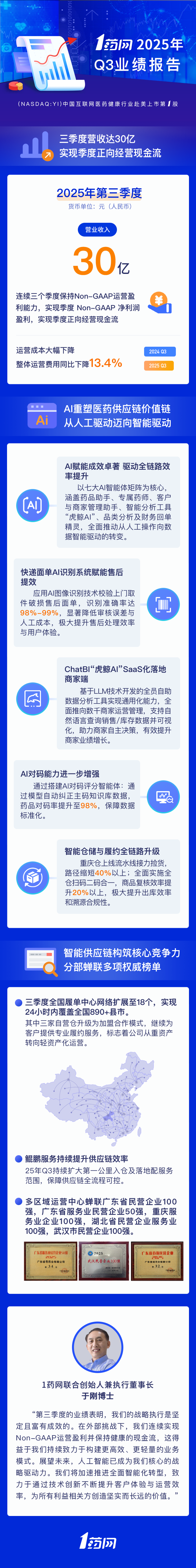 12月17日,1药网(NASDAQ:YI)发布2025年第三季度业绩报告,公司实现总收入30亿元人民币。通过持续的精细化运营与成本管控,总运营成本同比下降13.4%,运营效率显著提升。