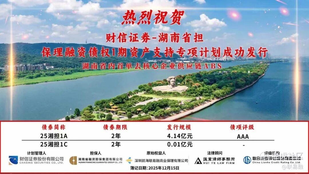 近日,由财信证券担任管理人、湖南省融资担保集团提供担保支持的“财信证券 - 湖南省担 - 保理融资债权 1 期资产支持专项计划”成功发行,发行规模4.15亿元,是湖南省内首单去核心企业供应链ABS。作为国内领先的供应链金融科技解决方案服务商,联易融在本次业务中担任原始权益人与资产服务机构,以全流程数字化技术能力为项目保驾护航。