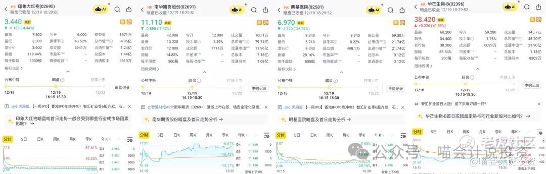 大红袍——辉立暗盘开盘曾一度被拉到7.6港元(+111.11%),维持了没几分钟就下来了,大部分时间在开盘价附近晃悠,收盘略微跌破发行价;富途暗盘价格要高不少,最低到发行价。