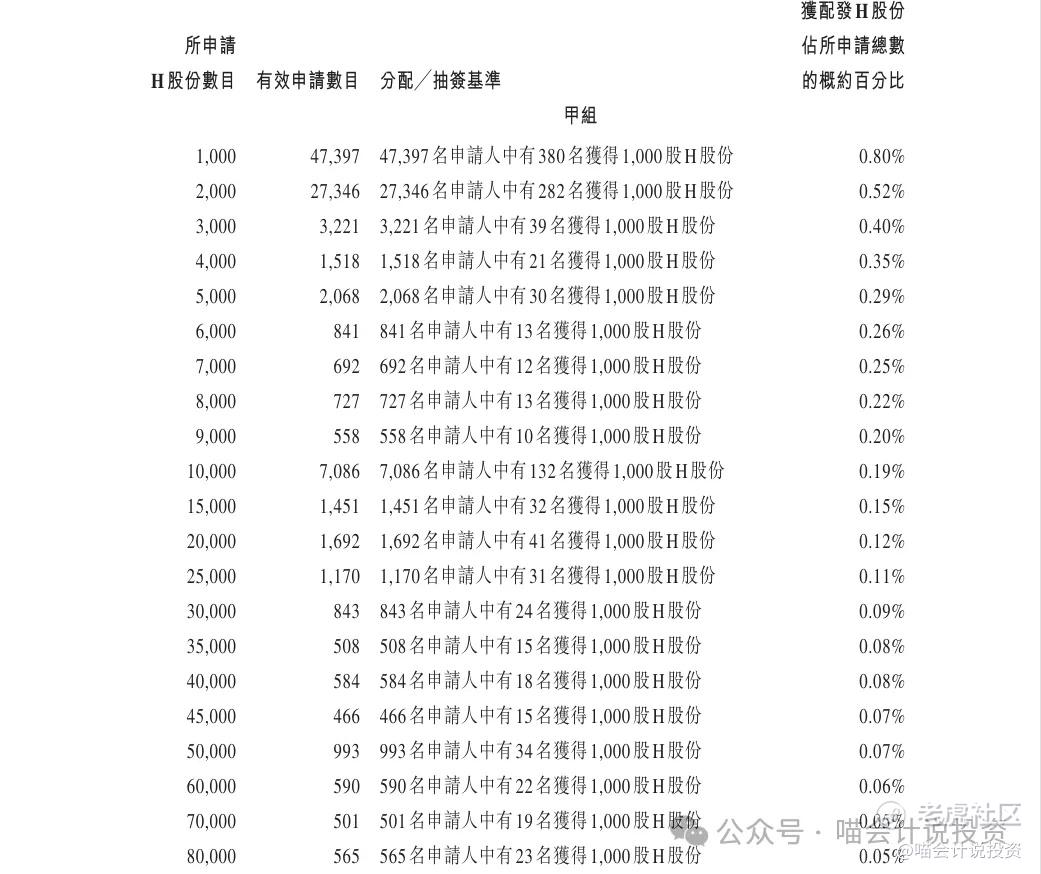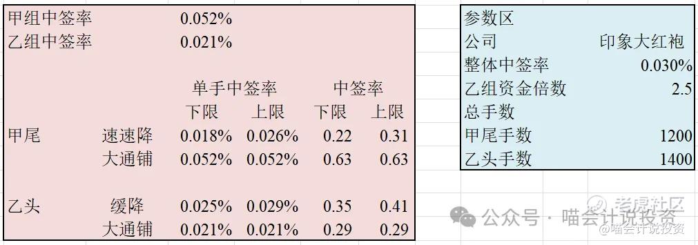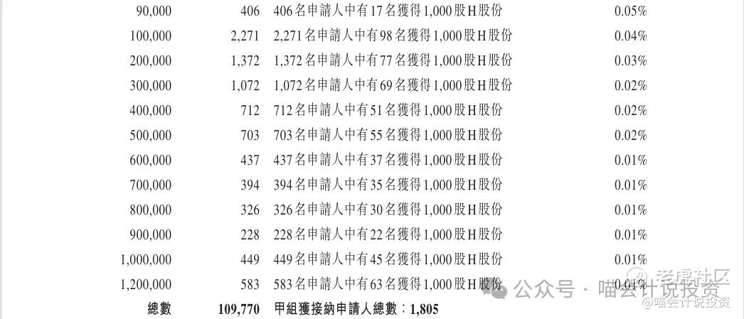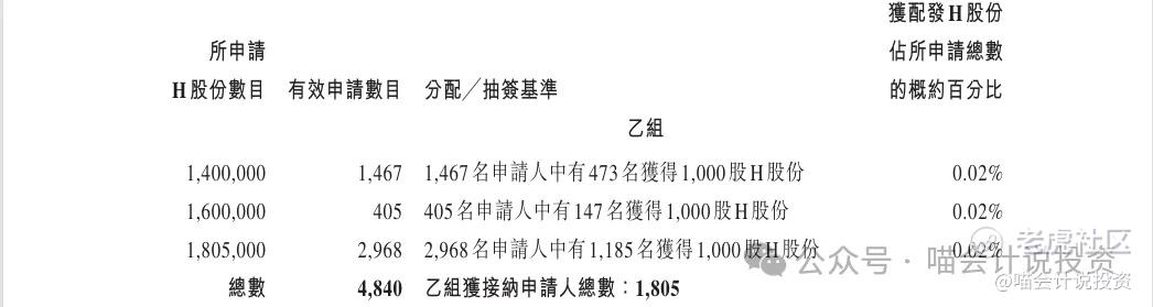 乙组分配:近似大通铺,乙头单手中签率万分之2.30(为乙组均值的1.04倍),1400手中签率32.24%;顶头槌1805手中签率39.93%。