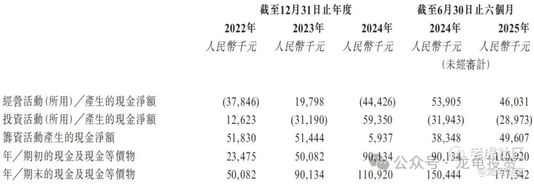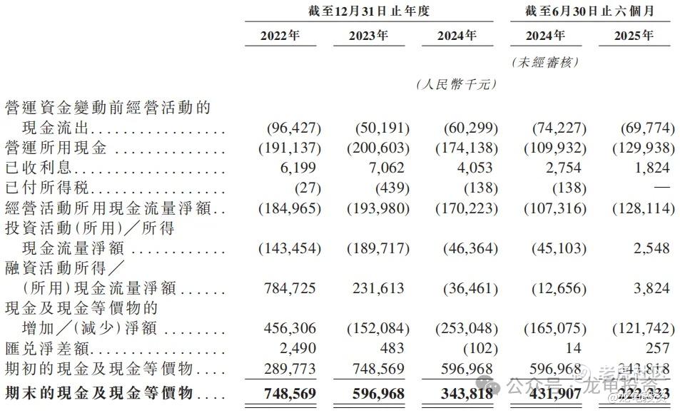 迅策经营现金流持续流出,全靠22、23年融资的10个亿在支撑,基本每年平均损耗1.5-2.0亿左右,25年H1现金及现金等价物2.22亿元。