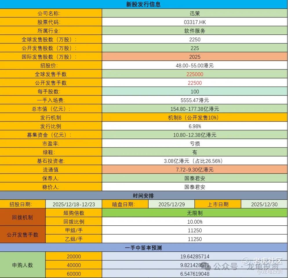 迅策全球发售2250万股,每手股数100股,招股价48-55港元,入场费5555.47港元,发行比例6.98%,募集资金10.80-12.38亿港元,甲乙组各11250手,孖展倍数3.85倍,人少货多,中签相对容易。