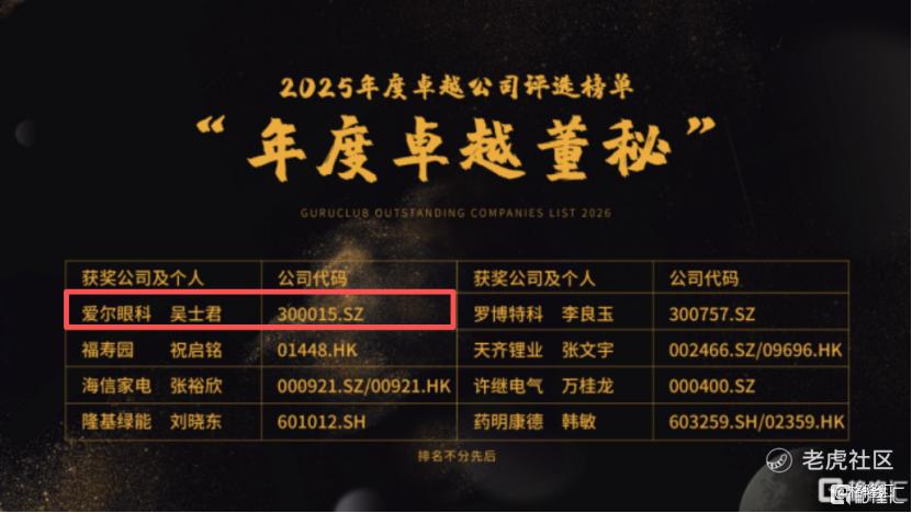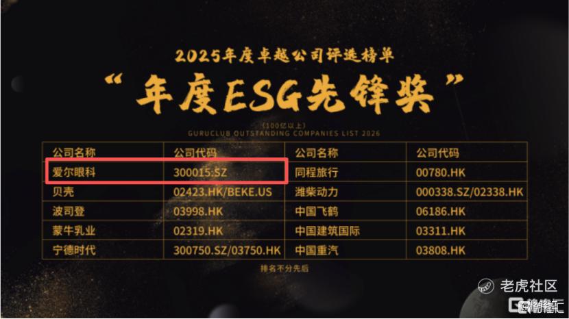 在刚刚公布的格隆汇“金格奖”名单上,爱尔眼科(300015.SZ)同时出现在两个重磅奖项的揭晓时刻:公司获评“年度ESG先锋奖(大市值)”,董事会秘书吴士君荣获“年度卓越董秘”。