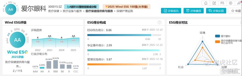 获得“年度ESG先锋奖”,标志着爱尔眼科的社会责任实践,已从传统的公益投入,演进为一套具备内在逻辑与可持续性的价值体系。其在WIND ESG评级中持续位居行业前列,2025年评级达到AA级,正是这一体系行之有效的数据印证。