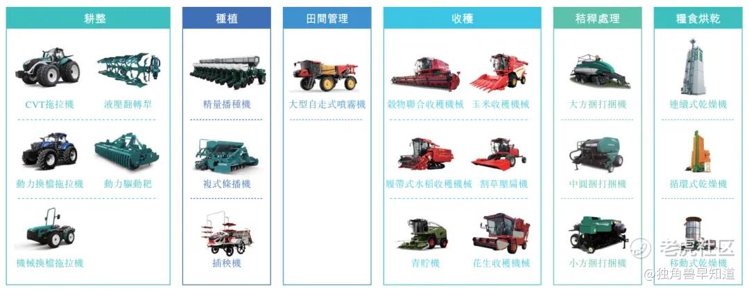 农机具。公司拓展农机具的广泛产品线,涵盖耕整、种植、田间管理、秸秆处理和粮食烘干等领域,为多种农机之间的协同作业效应奠定了坚实基础。公司的核心产品包括高速精量播种机、复式条播机、高密度大方捆、自走式喷雾机、400T连续式干燥机等。