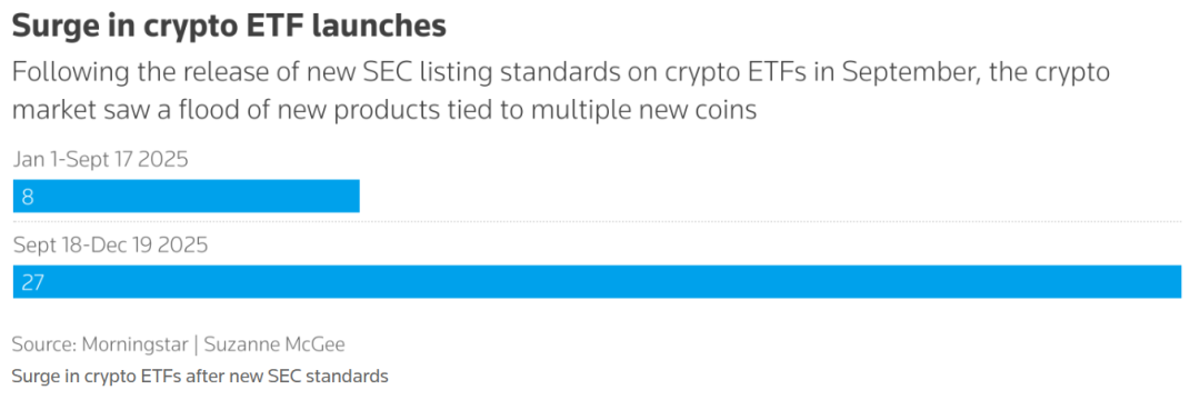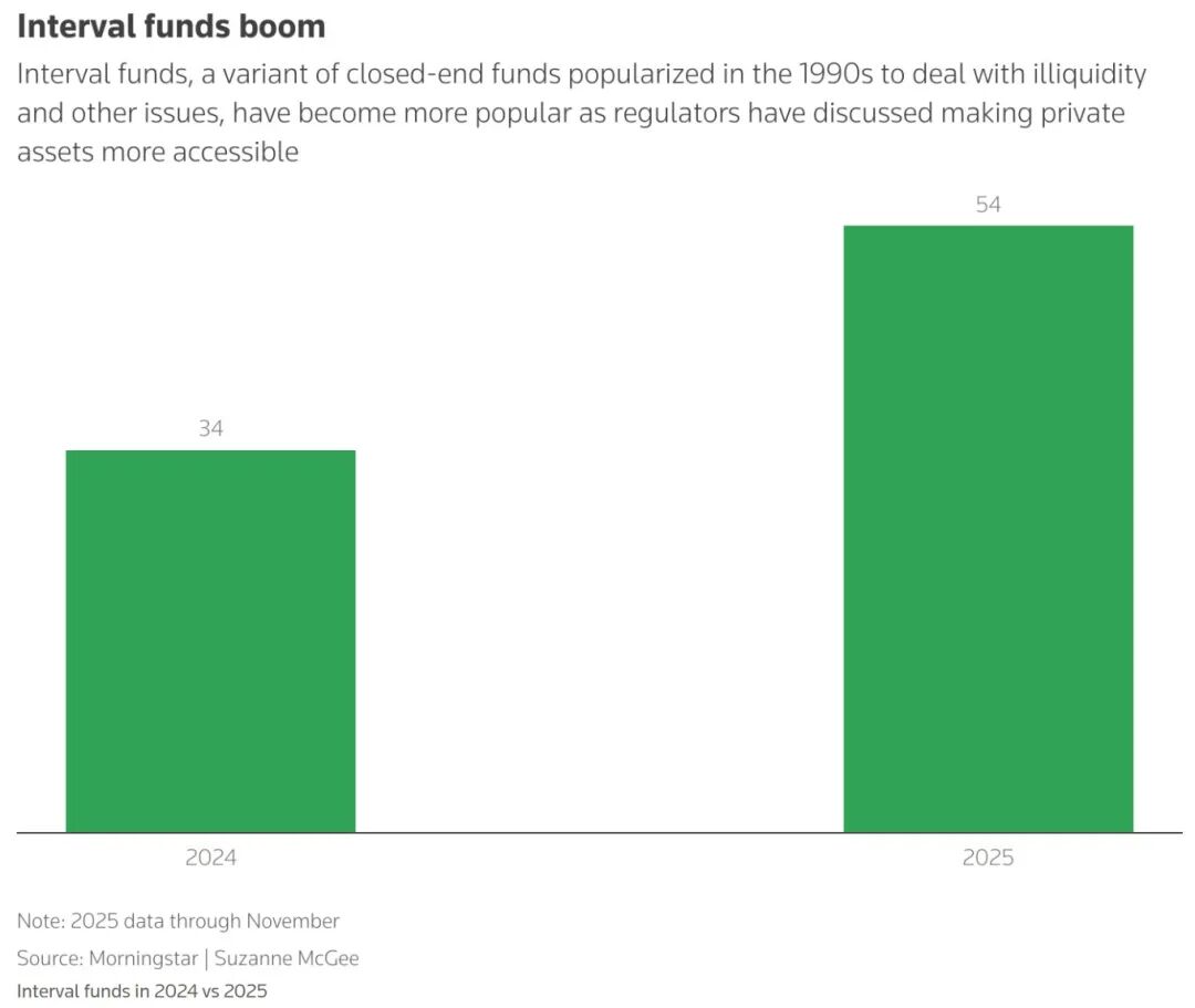 晨星公司的数据显示,自 9 月引入通用上市标准以来,新的加密货币 ETF 数量有所增加。Bitwise 资产管理公司近期预测,2026 年可能还会有 100 只相关产品面世。此外,间隔基金 (Interval funds,一种投资于私人资产的封闭式基金) 也有所增加,因为它们被视为能从退休计划的开放中获益。