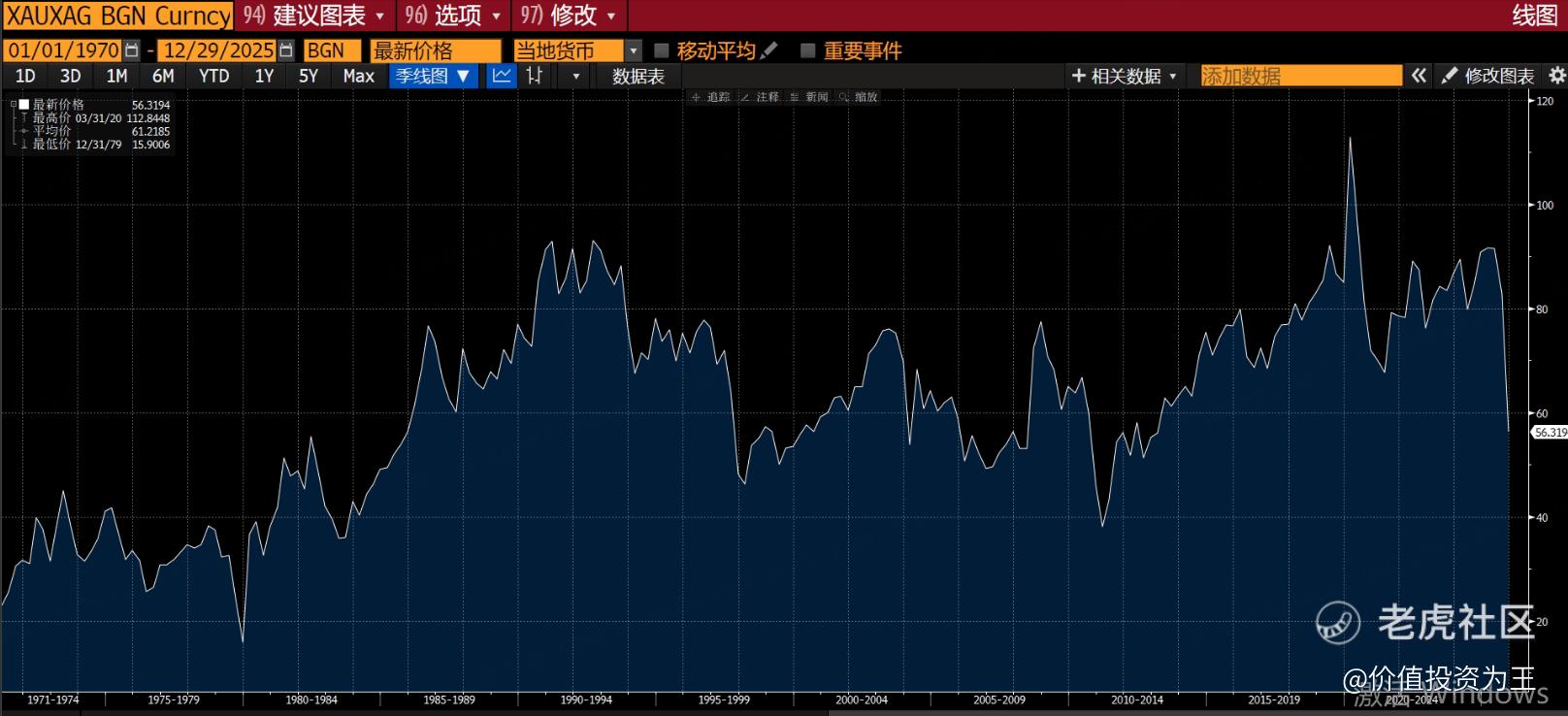 金银比目前回落至56,对比历史,不算太极端。这轮牛市如果继续下去,比值有可能奔着40而去,意味着银价还有将近40%左右的涨幅!