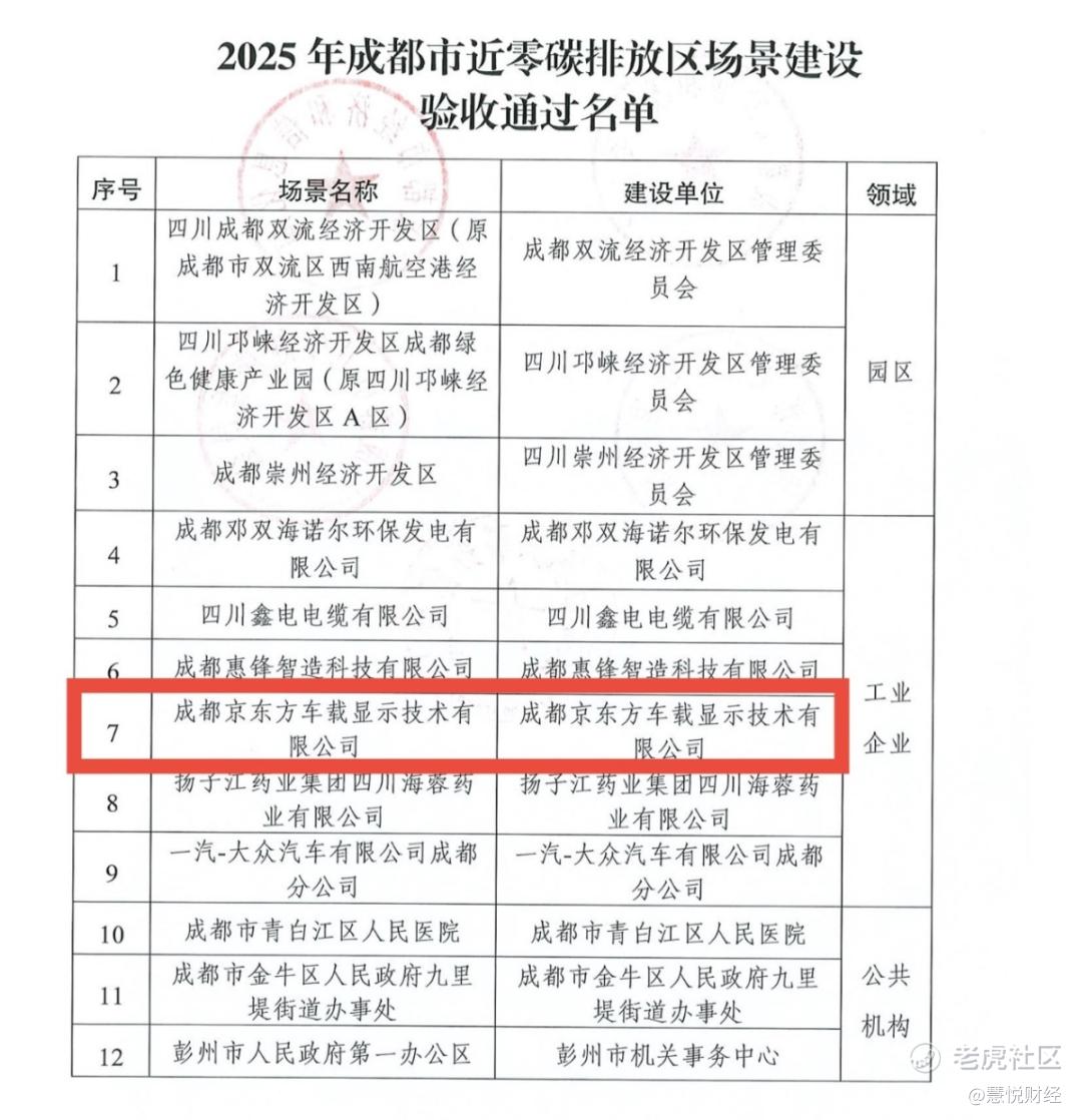 近日,京东方精电成都车载显示基地凭借在绿色低碳发展领域的系统性建设与显著成效,经成都市生态环境局等七部门严格评估,正式通过“成都市近零碳排放工业企业”验收,成为成都市唯一通过验收的车载显示企业,这也是继2024年获评“四川省绿色工厂”后的又一权威认证,标志着京东方精电在绿色智能制造和可持续发展道路上再次树立行业新标杆。