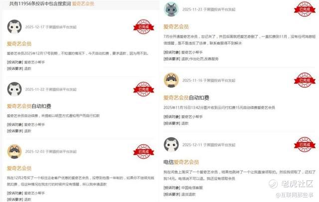 另外在黑猫投诉平台,包含爱奇艺会员的搜索词的投诉达到了11956条,其中有不少条同样指向扣费问题。