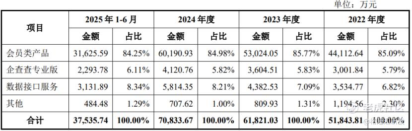 具体来看,2022年至2025年上半年(简称“报告期”),会员类产品为公司贡献了80%以上的营收,企查查专业版和数据接口服务的营收占比相对较低。