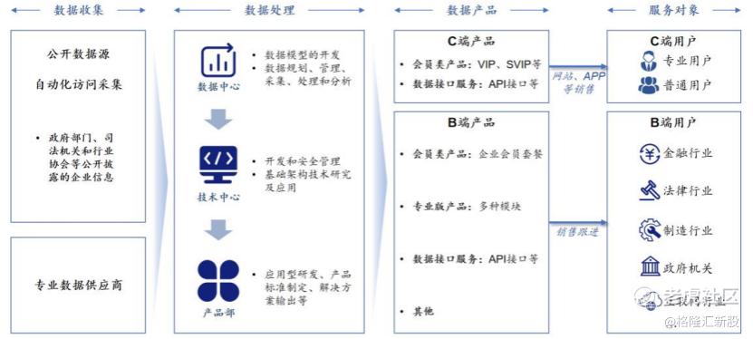 企查查以各地各级政府部门、司法机关、行业协会等依法公示的公开信息为主要基础原料,围绕不同实体经济领域的应用需要,对海量商业大数据进行收集、清洗、标注、挖掘和分析,并利用人工智能、大数据挖掘、可视化分析等先进的技术手段对数据进行结构化、标签化处理,并将有关联关系的离散数据建立联系。