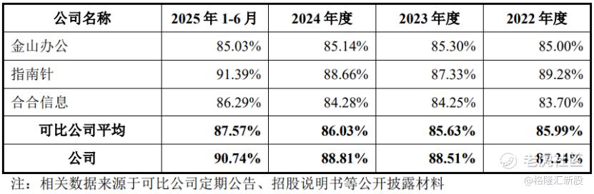 报告期各期,企查查的毛利率分别为87.24%、88.51%、88.81%和90.74%,保持较高水平,与金山办公、指南针、合合信息毛利率大致相当。