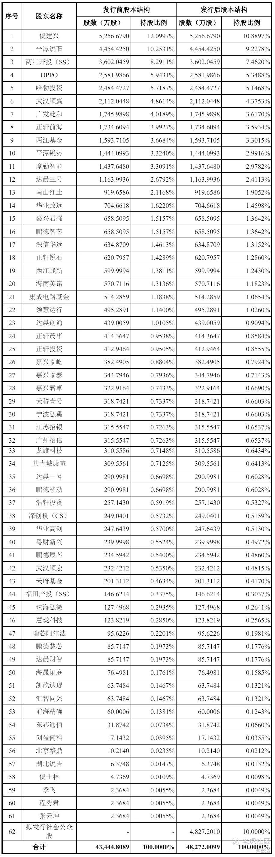 IPO后,倪建兴持股为10.8897%,平潭锐石持股为9.2278%,两江开投(SS)持股7.4620%,OPPO持股为5.3488%,**旗下哈勃投资持股5.1468%,武汉顺赢持股为4.3753%,广发乾和持股为3.6170%,正轩前海持股为3.5934%,两江基金持股为3.3015%,平潭锐势持股为2.9916%,摩勤智能持股为2.9782%;