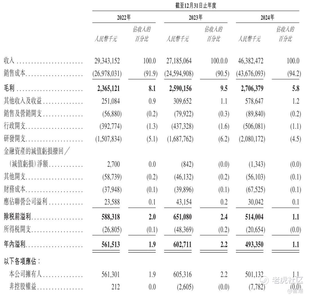 招股书显示,龙旗科技2022年、2023年、2024年营收分别为293.43亿元、271.85亿元、463.82亿元;毛利分别为23.65亿元、25.9亿元、27亿元;毛利率分别为8.1%、9.5%、5.8%。